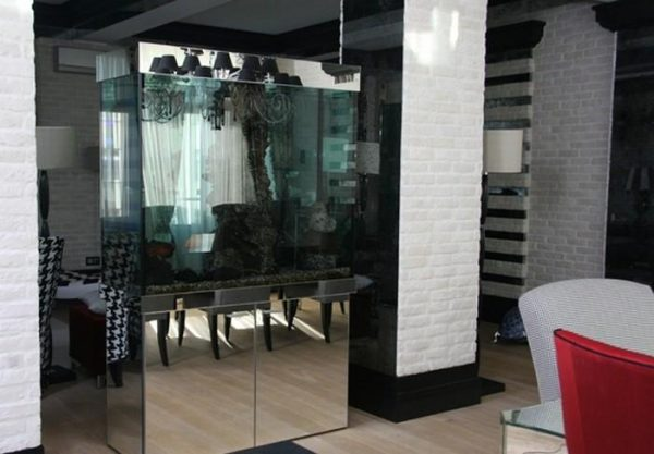 В спальне сделаны красные акценты на фасадах мебели. Возраст ремонта выдает использование аквариума для зонирования помещения.