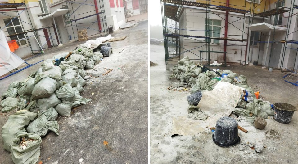 Она отметила, что придомовая территория находится в ужасном состоянии. Чтобы дойти до подъездов, жителям приходится пробираться по цементу и шпатлевке через груду мешков со строительным мусором.