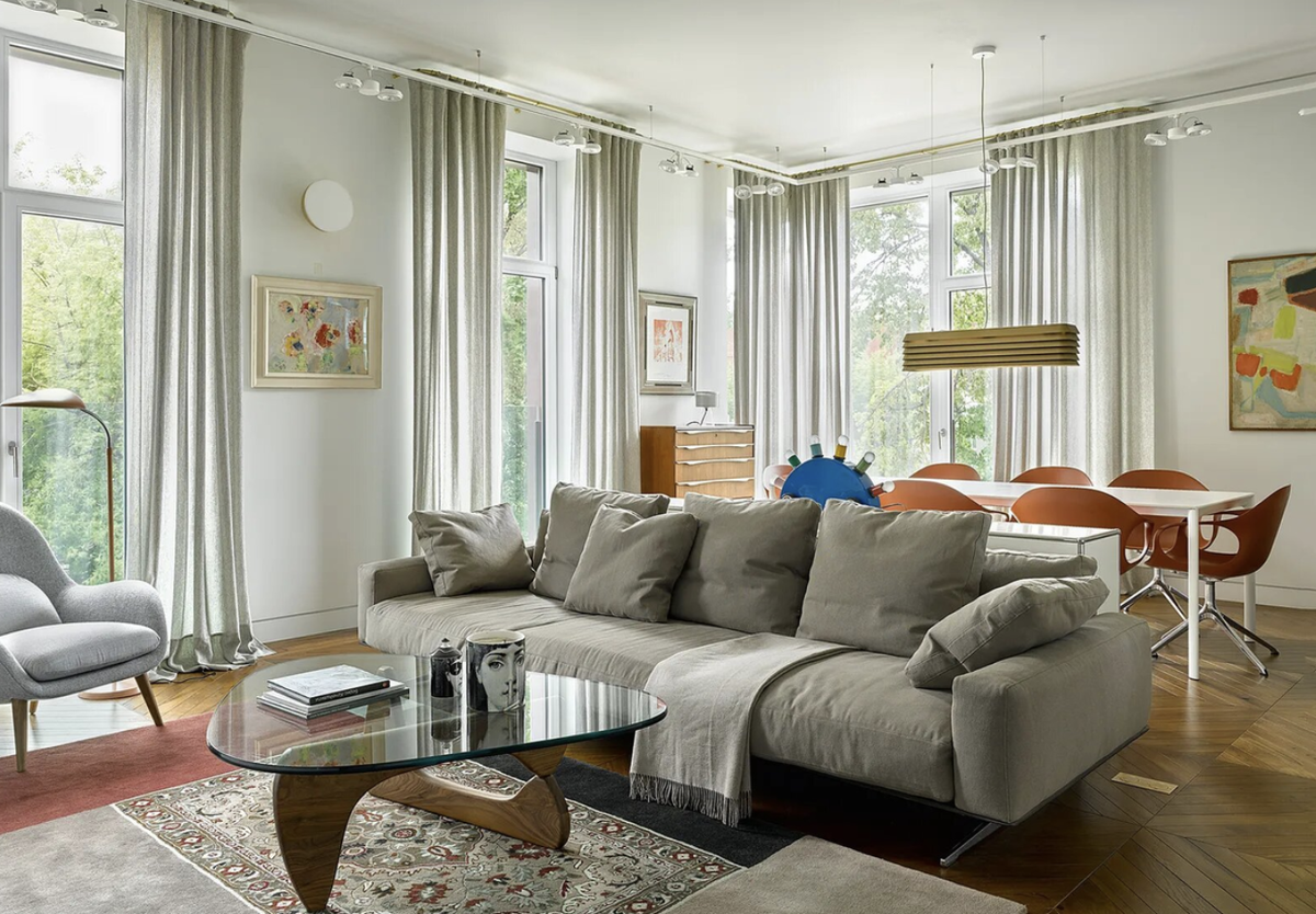 Примечателен паркет — его привезли из Италии, где реставрировали старинные особняки. Отреставрировали его и здесь, разместив в квартире. Однако перестарались — и вышло излишне скользко. Поэтому пришлось использовать ковролин в одной из комнат.