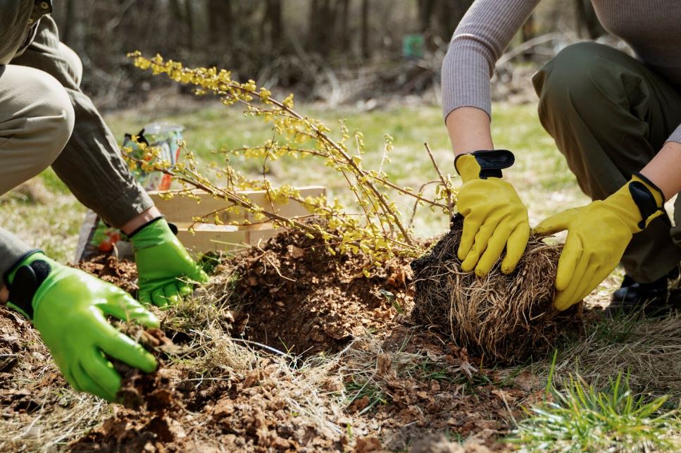 Перевяжите куст шпагатом, чтобы было удобнее, подкопайте на расстоянии 50 см от ствола — и вынимайте с комом или без — перенесите на новое место.