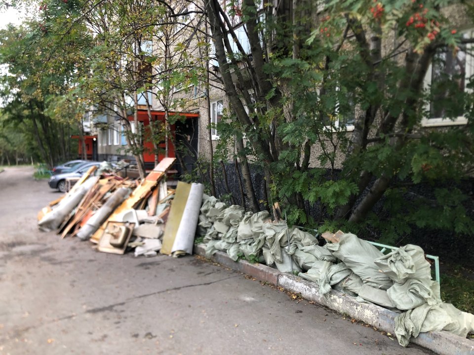 Судя по опубликованным фотографиям, строительный хлам свален вдоль всего палисадника и у подъездных дверей — это остатки деревянных перегородок, обои, мусор в мешках, а также в старой ванне при входе в подъезд.