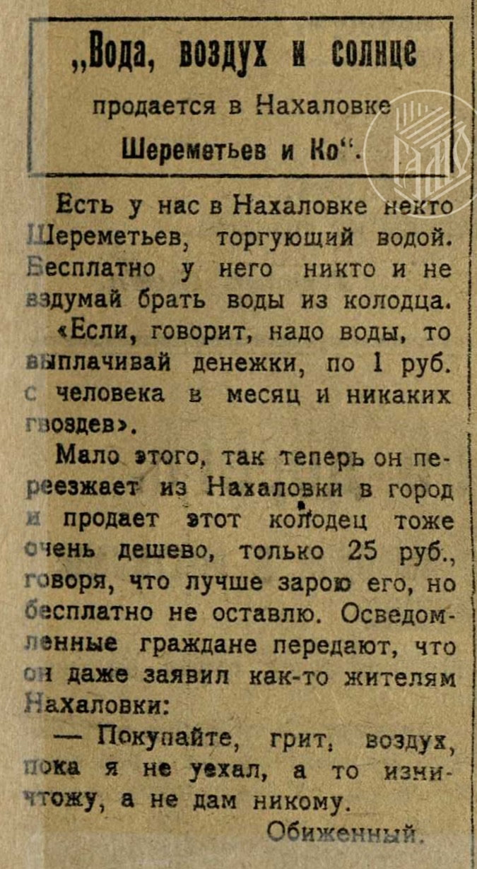 О предприимчивом мурманчанине, который пытался «дурить» земляков сто лет назад, в рамках рубрики «Эхо столетия» рассказали в областном Госархиве. Сотрудникам архивной службы в руки попалась публикация газеты «Полярная правда», вышедшая в свет в октябре 1925 года. Статья называлась «Вода, воздух и солнце продается в Нахаловке: Шереметьев и Ко».