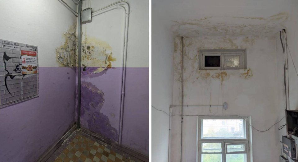 По ее словам, от сырости в подъезде появилась плесень. Жительница областного центра опубликовала в качестве доказательства фотографии, на которых заметны сильные потеки на стенах и потолке в подъезде, а краска и побелка облупились.