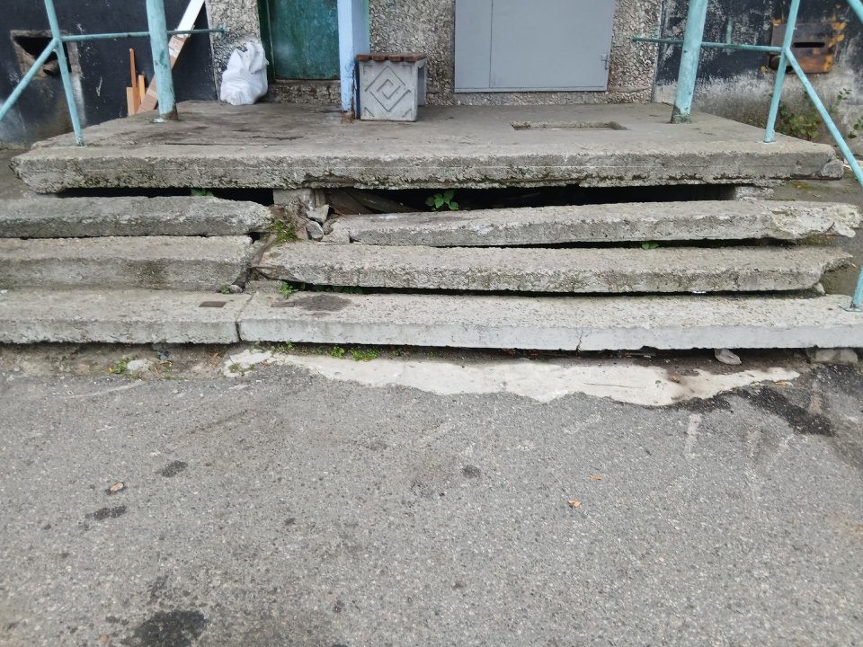 «Ступеньки провалились, на крыше растет мох»: в Молочном пожаловались на состояние подъезда в жилом доме
