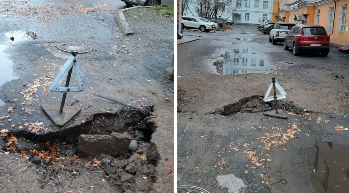 В Мурманске во дворе по ул. К. Маркса, 8/2 и пр. Рыбный, 4 за краеведческим музеем размыло яму, засыпанную после ремонта сетей. Об этом сообщили местные жители в соцсетях.