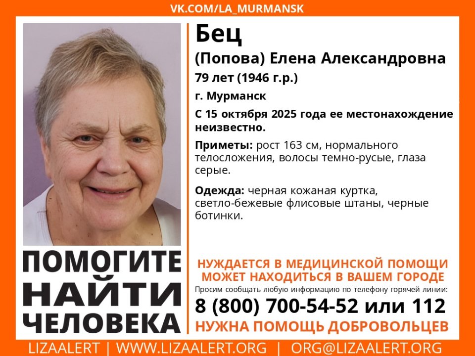 В Мурманске с 15 октября разыскивают 79-летнюю горожанку. Ищут женщину сотрудники поискового отряда «ЛизаАлерт». Они рассказали о приметах пропавшей.