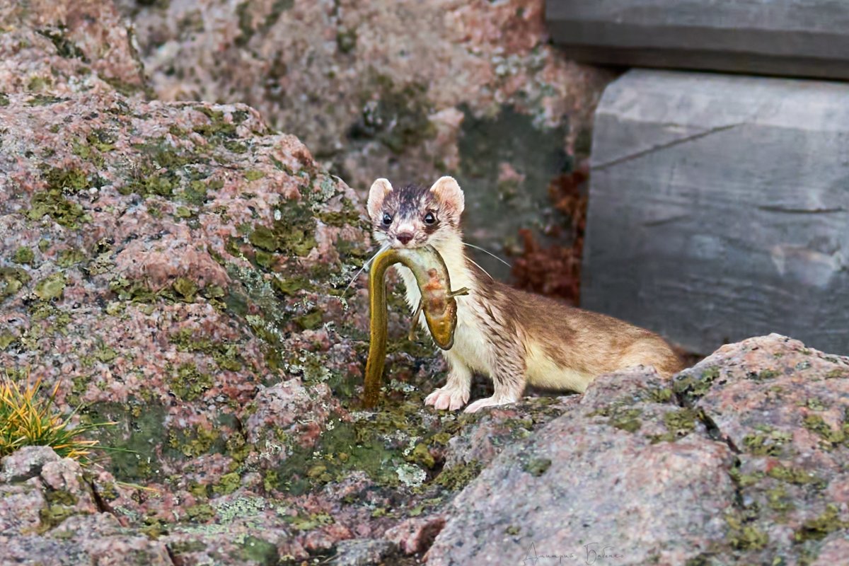 У горностая конец хвоста чёрного цвета. А вот у ласки, которая очень с ним схожа, нет. Подписчики автора снимка назвали животное «шустриком». Самое забавное, что в зубах у «горностая-ласки» была маленькая рыбка.