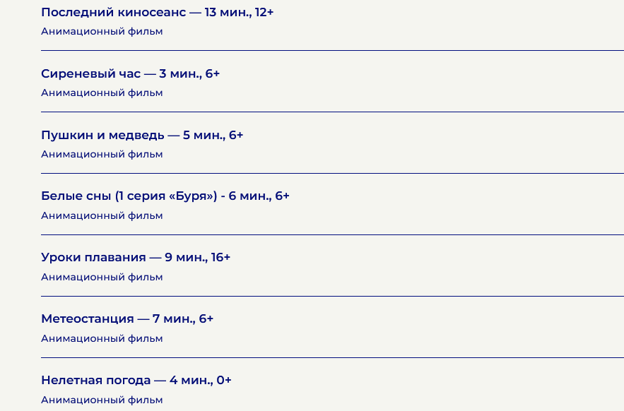 Мультфильмы небольшого хронометража — от 3 минут до 13. авторы — представители Уфы, Санкт-Петербурга, Москвы, Екатеринбурга. Например, в мультфильме «Метеостанция» рассказывается, как три белых медведя начали обживать метеостанцию в Арктике и чем закончилось их новоселье.