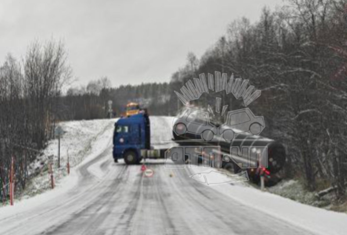 В районе Туломы занесло бензовоз — он встал поперек дороги