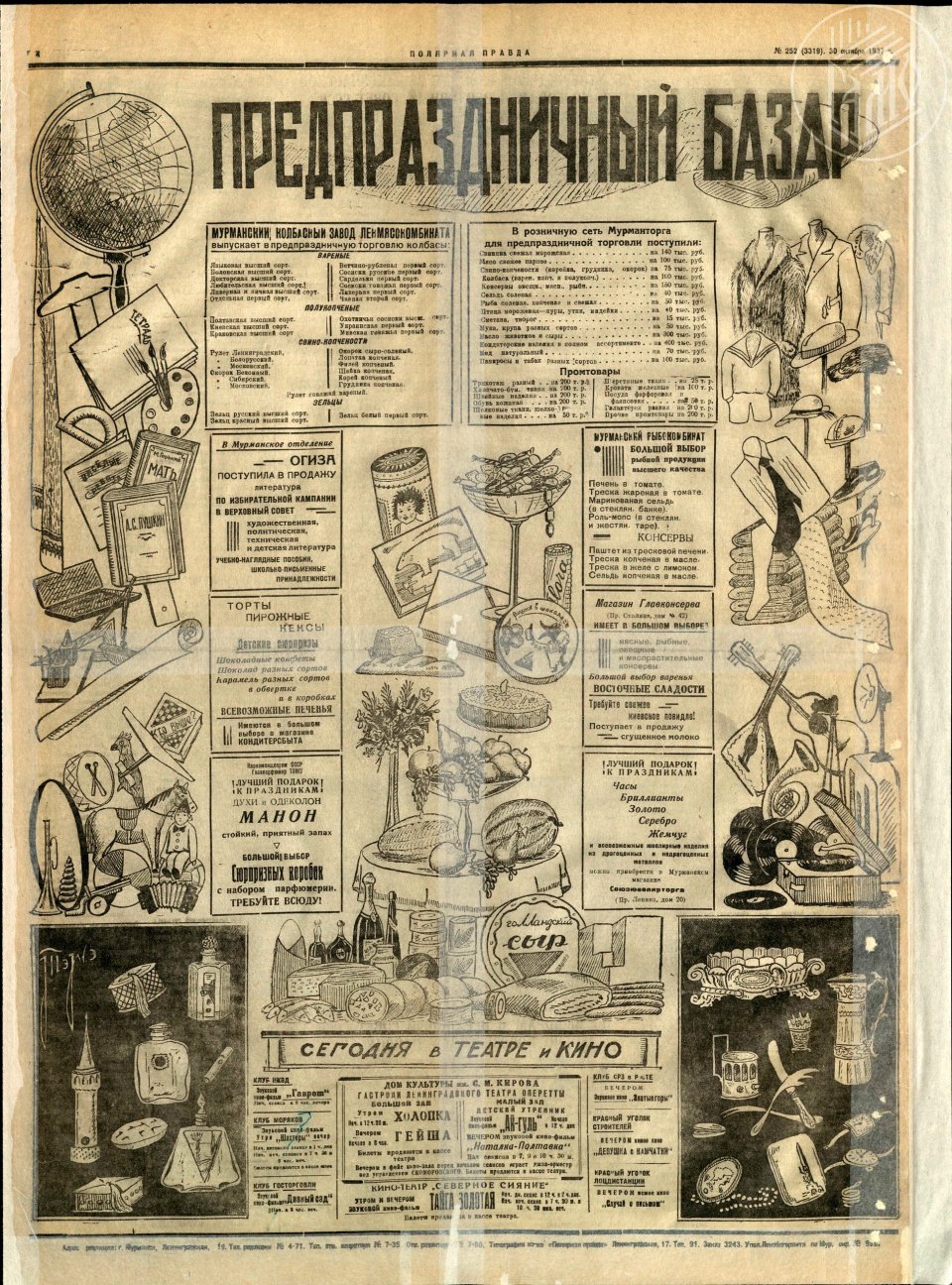 Восточные сладости, мясо, колбасы и прочие продукты. На ярмарке можно было приобрести книги и духи «Манон». Ассортимент товаров предстоящей ярмарки был размещён на странице газеты «Полярная правда» в конце октября 1937 года. В рамках рубрики «Реклама в стиле ретро» мурманские архивисты опубликовали эту газетную вырезку в соцсети. Заметка рекламировала не только ассортимент продуктовых рядов, но и культурную программу.