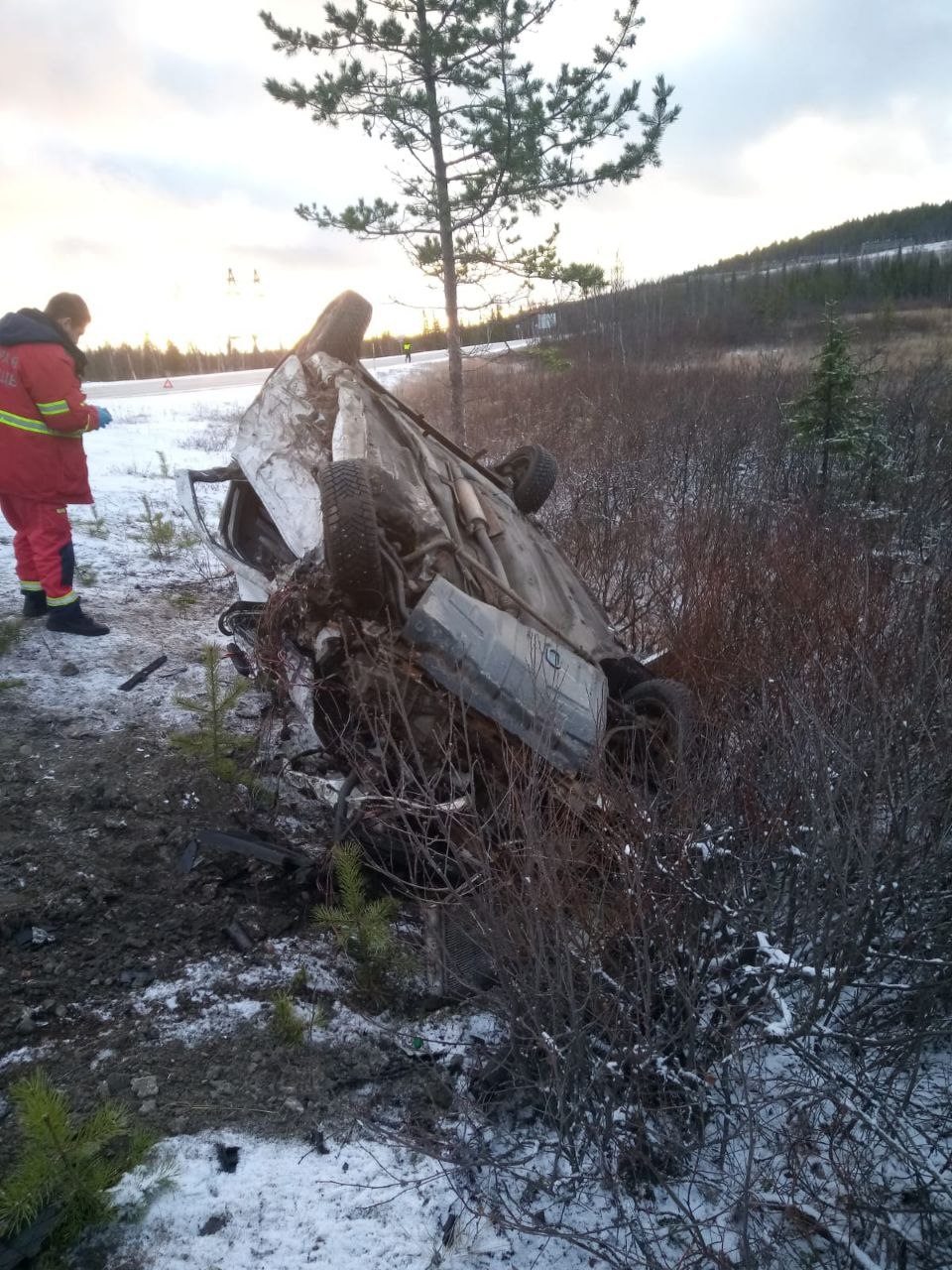 Это случилось на 1309 км «ленингадки». От удара отечественная легковушка съехала в кювет и там перевернулась. Машина сильно повреждена. У неё смята верхняя часть кузова.