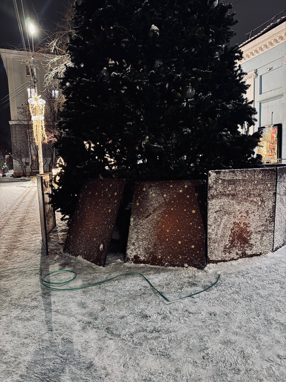 В мурманской Росте на новогодней ели еще не успели зажечь огни, а вандалы уже разбили основание и игрушки