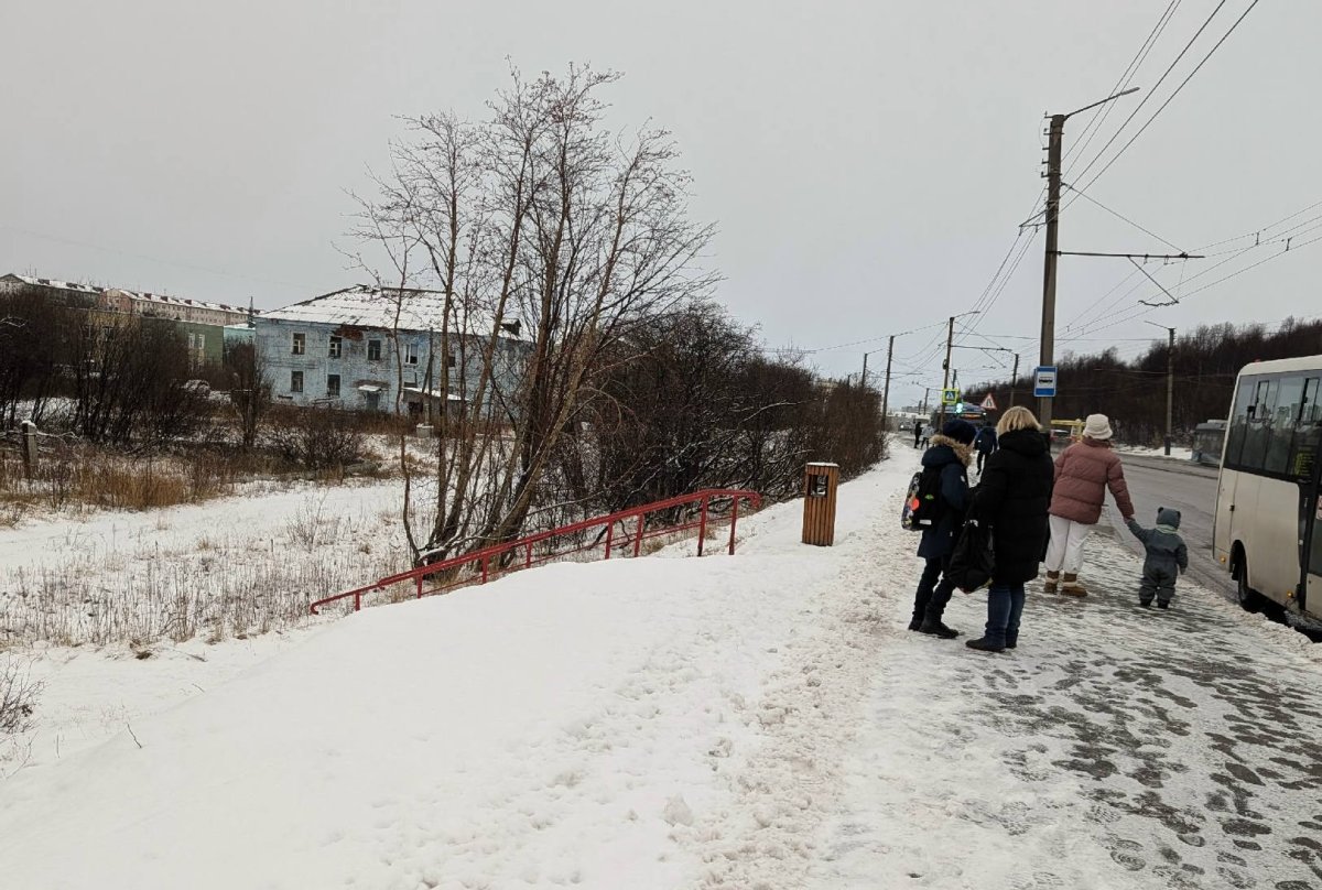 Она выложила фотографию, на которой мурманчане с маленькими детьми стоят в ожидании автобуса на занесённом снегом тротуаре.