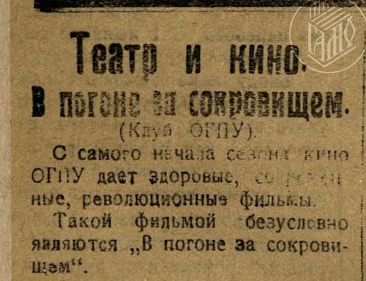 Один из популярных жанров кино у россиян, в том числе, жителей Заполярья — остросюжетные приключенческие фильмы. Боевики любили и жители Мурманска 20-х годов прошлого века. Сто лет назад в кинозале клуба ОГПУ — особого государственного политического управления СССР предлагали посмотреть первую серию боевика с актуальным сюжетом под названием «В погоне за сокровищем». Об этом рассказали в Госархиве региона в рамках рубрики «Эхо столетия».