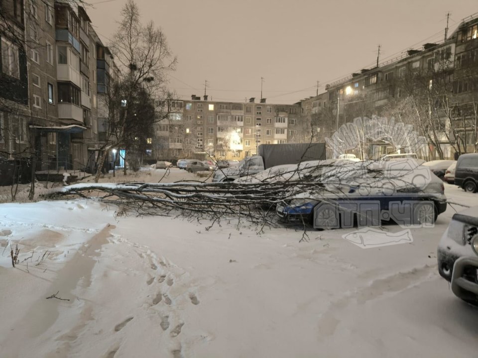 Ствол перекрыл проезд. Аналогичная ситуация произошла возле дома № 22 на Копытова. Только в этом случае дерево обрушилось сразу на две машины — они были припаркованы рядом друг с другом.