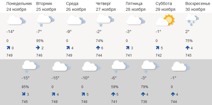 26 ноября будет -9-14 градусов. 27 ноября активный циклон сместится с Норвежского моря на юго-запад Баренцева. В регионе — снегопад, сильный ветер и -4-9 градуса. Что касается Мурманска, то Гидрометцентр России обещает потепление с завтрашнего дня. Сильный скачок будет в четверг -4 градуса, а в воскресенье столбики термометров поднимутся до отметки +2.