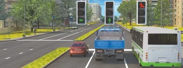 Получается, грузовик может проехать прямо со средней полосы. Другие машины не могут двигаться прямо со своих полос.