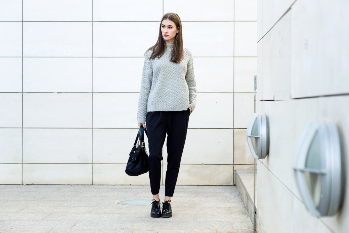 Второй образ уже в стиле «тихая роскошь». Нужен простой вязаный свитер и балетки на небольшом каблуке. Акцент на качестве вещей.