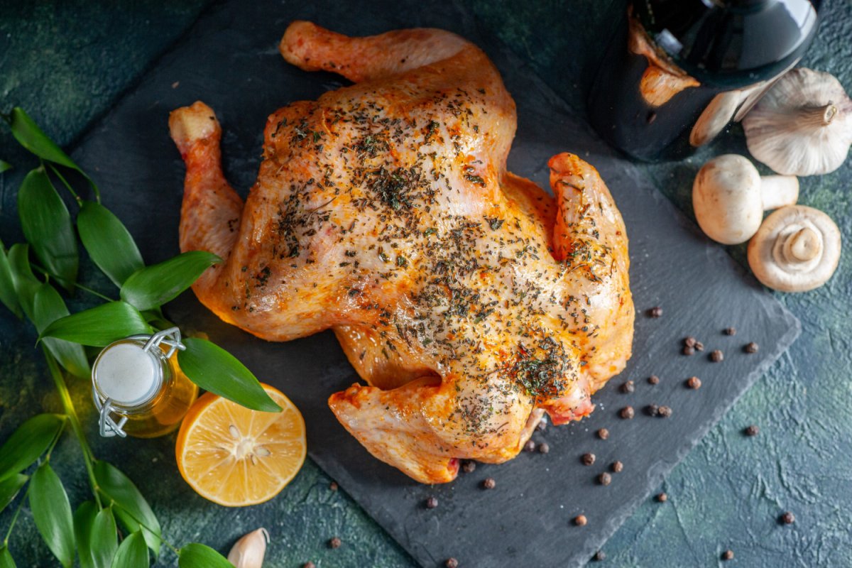 Курицу надо помыть и обсушить. Дальше аккуратно отделяем кожу от мяса по всей тушке, только не порвите. Так надо, чтобы размазать специи прямо под кожей.
