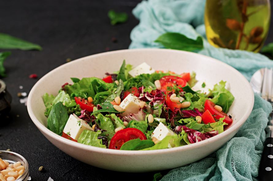 Итак, первым слоем кладём рваные листья салата, но эстеты могут и порезать, затем — резаные кубиками помидоры и курочку. Затем — оливки и брынзу. Присыпьте травами и готовьте заправку, пока салат знакомится сам с собой.