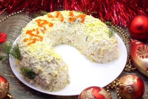 Если уж сегодня в салате с крабовыми палочками оказывается курица — то почему бы не украсить оливье икрой, задумывается «ГОТОВИТЬ ПРОСТО». А если учесть, что наступает Год Лошади, то веточки зелени просто необходимы. Салат можно уложить подковой или постараться — и выложить голову лошади. Подавайте в красном салатнике или с золотыми салфетками. Словом, традиции так традиции.