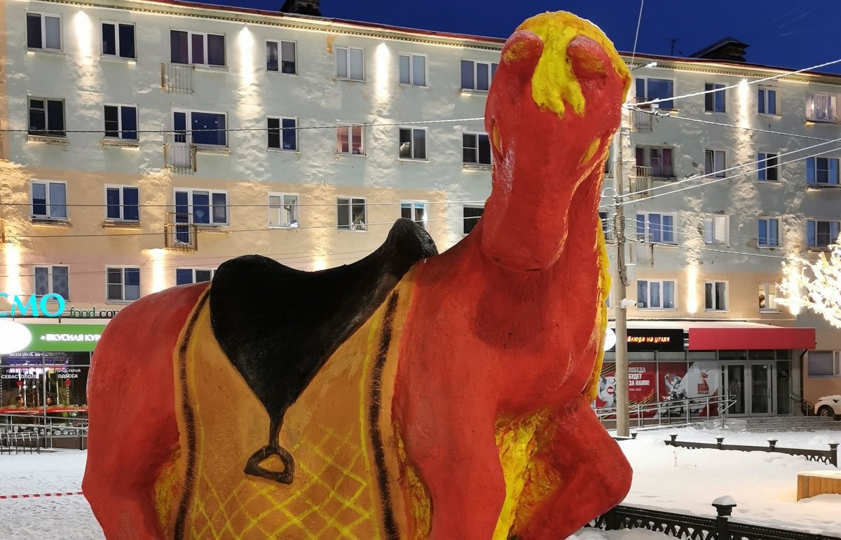 В Мончегорске по традиции центральную площадь украсила снежная фигура, выполненная в виде символа будущего года. Тотем 2026-го — огненная Лошадь. Созданием фигуры из снега занимались сотрудники предприятия «Печенгастрой». Лошадь получилась яркой — красного окраса с жёлтыми гривой и хвостом. Туловище прикрывает попона и чёрное седло.