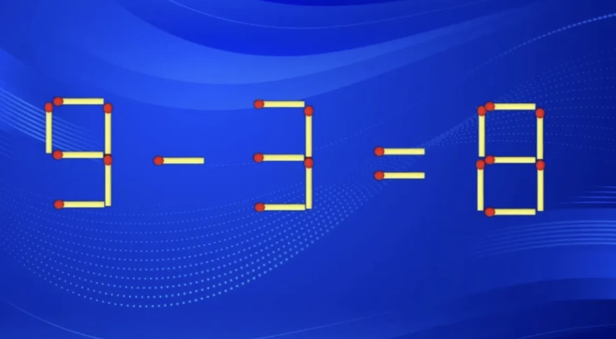 Вот и мы предлагаем проверить свою смекалку прямо сейчас. Посмотрите на картинку, на ней неправильный пример «9-3=8». Вам нужно переложить 1 спичку так, чтобы пример стал правильным. Не торопитесь, подумайте.