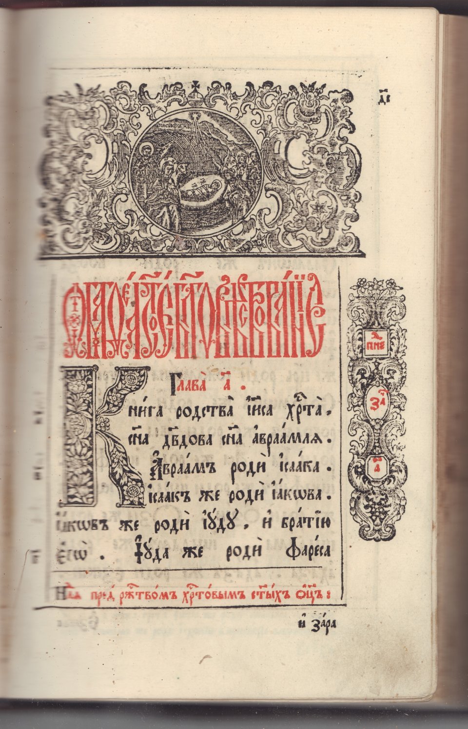 Оформлена гравюрами с изображением евангелистов, заставками, инициалами растительного. Бумага с водяными знаками. Последнюю страницу украшает экслибрис. Это круглая печать с изображением человеческого профиля и инициалами. В годы своего издания, а это время правления Екатерины Великой, книга стоила 2,5 рубля. Цена указана на последней странице.