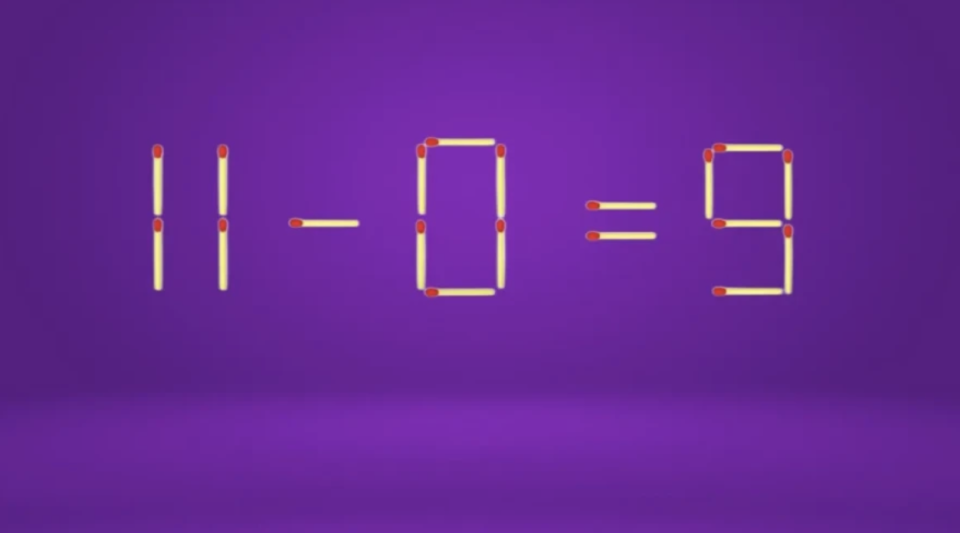 Решение простое: возьмите одну спичку из цифры «9», и она превратится в «3». Эту спичку добавьте к «0», и он станет «8». Так мы получаем правильное равенство: «11-8=3».