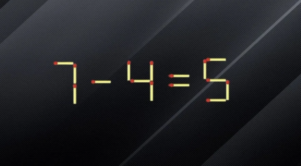 Предлагаем вам решить одну из таких задач. Посмотрите на равенство «7-4=5». В нём ошибка. Вам нужно исправить его, передвинув всего одну спичку.