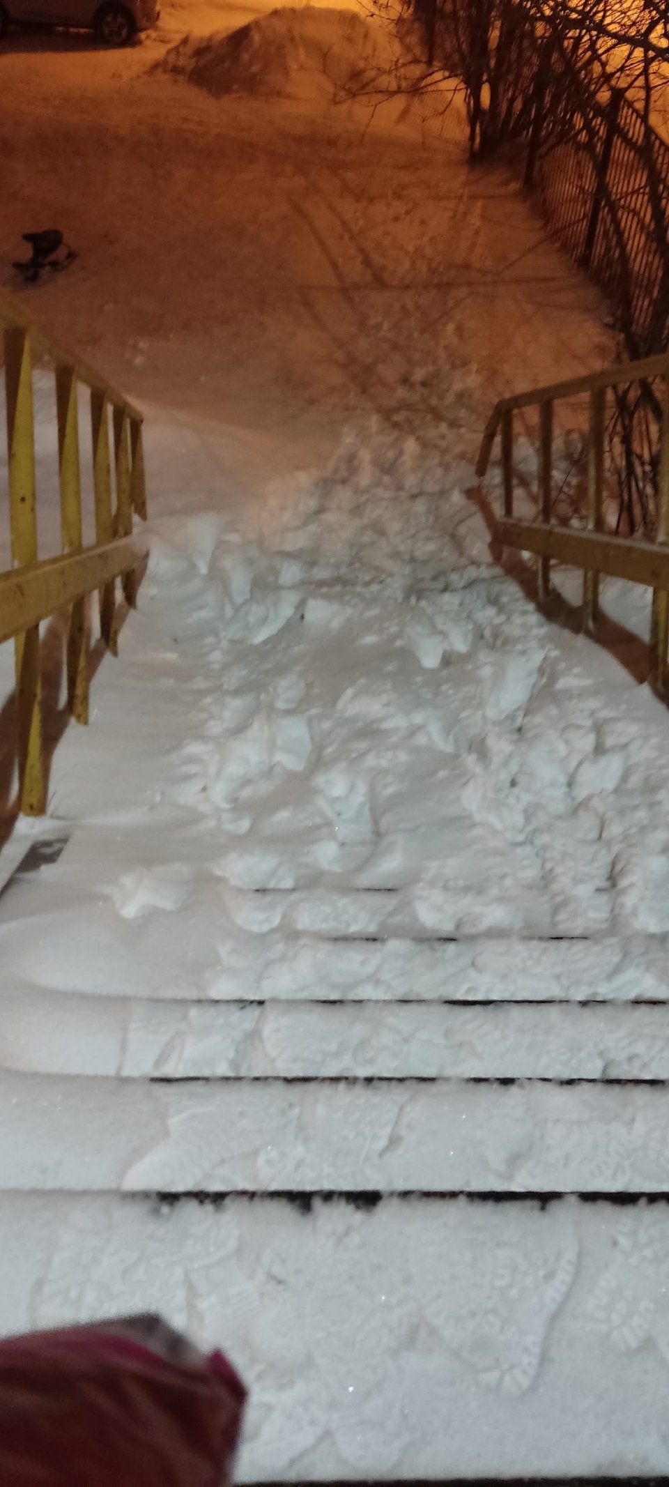 На кадрах с трудом можно заметить очертания ступенек. Заметённая снегом лестница стала почти как горка. Конструкцитя немаленькая и при падении здесь можно получить серьёзные травмы вплоть до переломов.