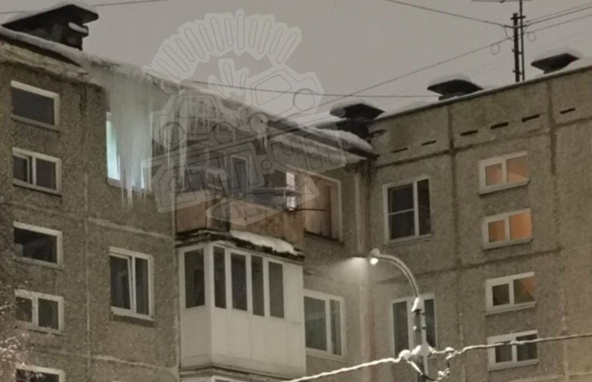 В Мурманске жильцы квартиры, расположенной на пятом этаже дома № 20 на Копытова, выглядывая в окно, видят не свой двор, а глыбу льда. Сосулька образовалась на крыше здания и росла день за днём. К концу декабря она стала шириной в метр, а длиной — в два.