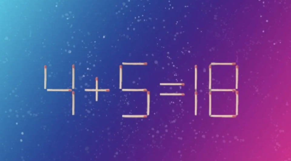 Перед вами неверный пример «4+5=18». Чтобы решить такую головоломку, вам нужно подумать, куда переложить 1 спичку. Решение, на самом деле, простое. Попробуйте представить равенство в голове, и станет легче.