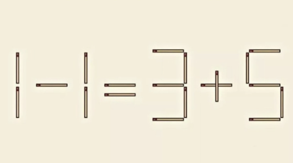 Перед вами не самая простая задачка со спичками «1-1=3+5». И чтобы сделать этот пример верным, вам нужно переложить всего 1 спичку. Не торопитесь, подумайте, как это сделать.