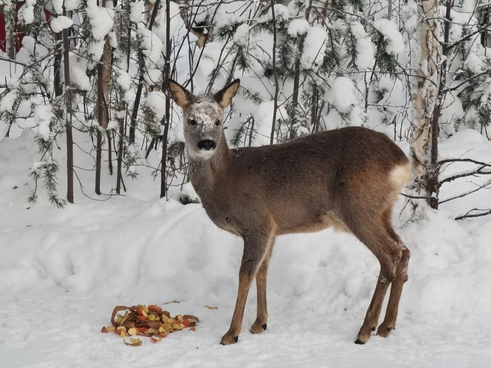 Когда в Раякоски косулям не достаются гостинцы, они возле птичьих кормушек подъедают семечки. Как рассказали в заповеднике «Пасвик», в лесу зимой косули обгладывают ветки деревьев. Поедают мох и лишайник, которые копытами выкапывают из-под снега.