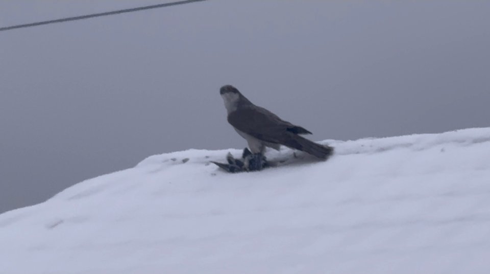 Оказалось, что хищная птица — это ястреб-тетеревятник. А его жертвой на самом деле стал сизый голубь, у которого не было шансов спастись. Это можно понять, заметив, как крепко когтистыми лапами ястреб держит голубя. Только перья разлетались по заснеженной крыше.