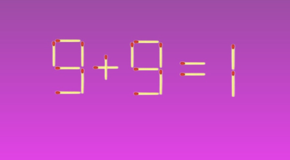 На картинке равенство: «9+9=1». Очевидно, что здесь есть ошибка. Ваша задача — исправить это, переместив всего одну спичку. Попробуйте представить, как можно изменить цифры или знак, чтобы равенство стало верным.