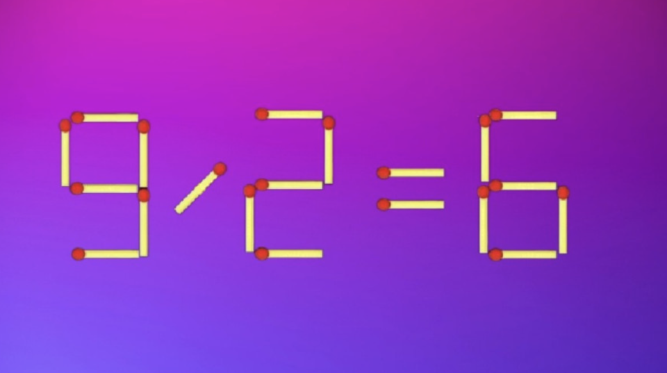 Сегодня мы предлагаем вам попробовать свои силы. Взгляните картинку: перед вами спичечное равенство «9/2=6». Здесь есть ошибка. Ваша задача — исправить её, переместив всего одну спичку. Только примените всю свою смекалку и креативность.