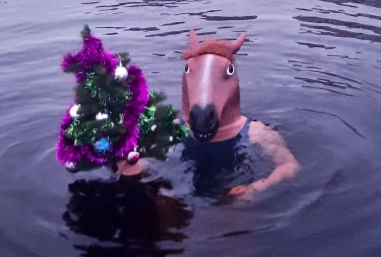 Были и ещё более оригинальные образы. Например, пара «моржей» надела на головы маски оленя и коня. Так оригинально пошутить решили молодой человек и девушка. Северянка стала «Бемби», а её спутник символом 2026 года — Лошадью. Взяв в руки новогоднюю искусственную ёлку, оленегорцы устроили заплыв.