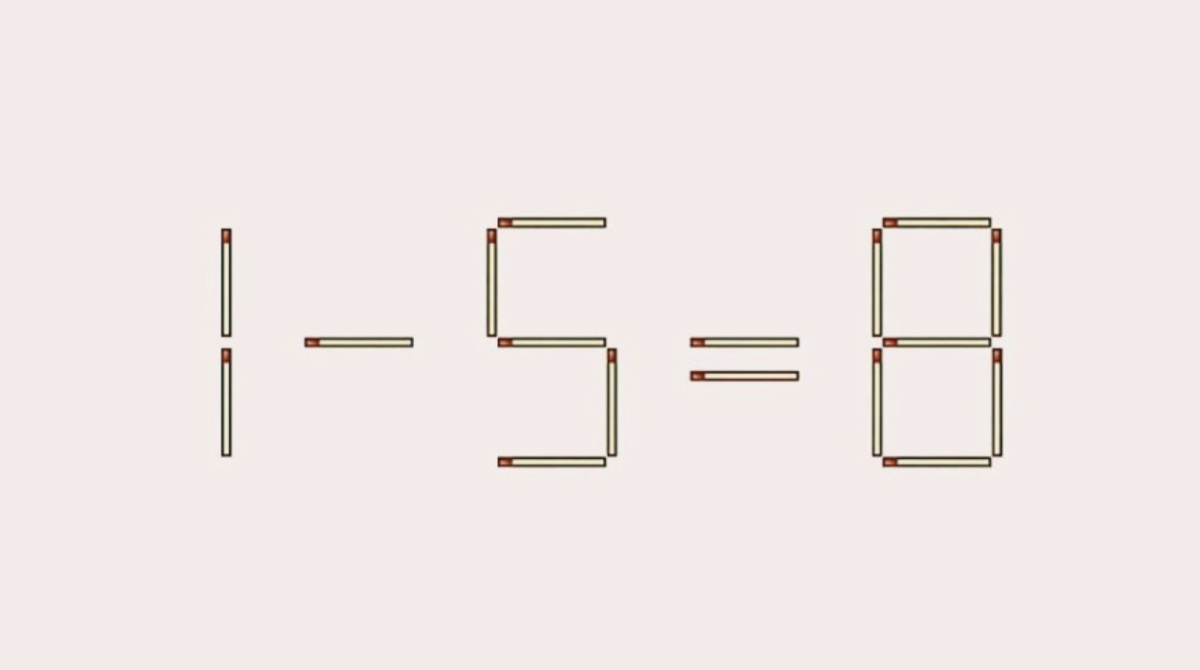Такую головоломку можно решить прям сейчас, где бы вы не находились. Посмотрите на картинку, на ней визуальный пример из палочек-спичек «1-5=8». И это неправильно. Попробуйте покрутить 1 спичкой, чтобы сделать пример правильным. И помните, что знаки тоже можно менять.