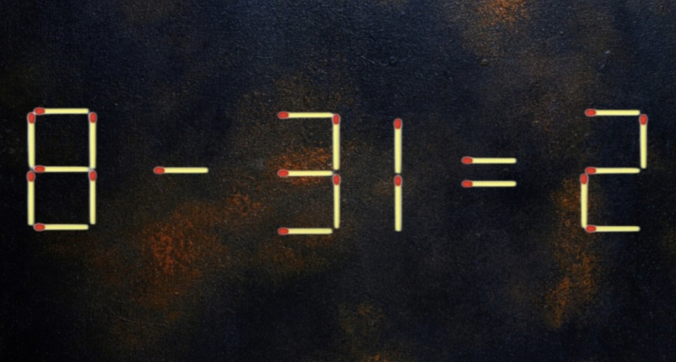 И вот, друзья, мы предлагаем вам такую задачку. Посмотрите на картинку: пример «8-31=2» явно неверный. Ваша задача — передвинуть всего одну спичку так, чтобы равенство стало правильным.