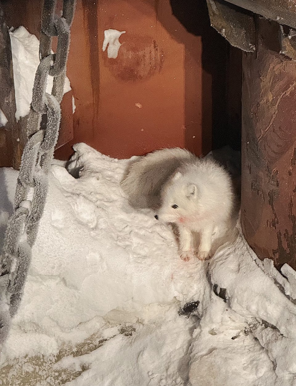 В порту Сабетта члены экипажа атомного ледокола «Сибирь» заметил белоснежную полярную лису. В принципе, ничего удивительного для этих северных краёв. Насмешил мурманских моряков внешний вид песца. На мордочке у него виднелись красные пятна.