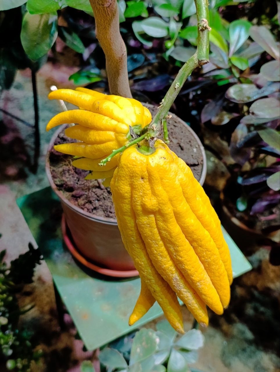 Растение называется «Рука Будды». Выглядит оно эффектно. Листья зелёные, а вот плод большой — яркого жёлтого цвета. Особенность его в том, что внешне он похож на руку человека. Отростки плода похожи на пальцы.