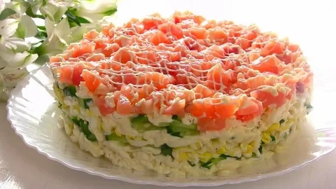 Салат слоёный, выкладывать будем следующими слоями: рыба, лук, картофель, майонез, сбрызнутые лимонным соком яблоки, белки, желтки. Сверху можно украсить зелёным луком, укропом или горками красной икры, можно имитированной, конечно.