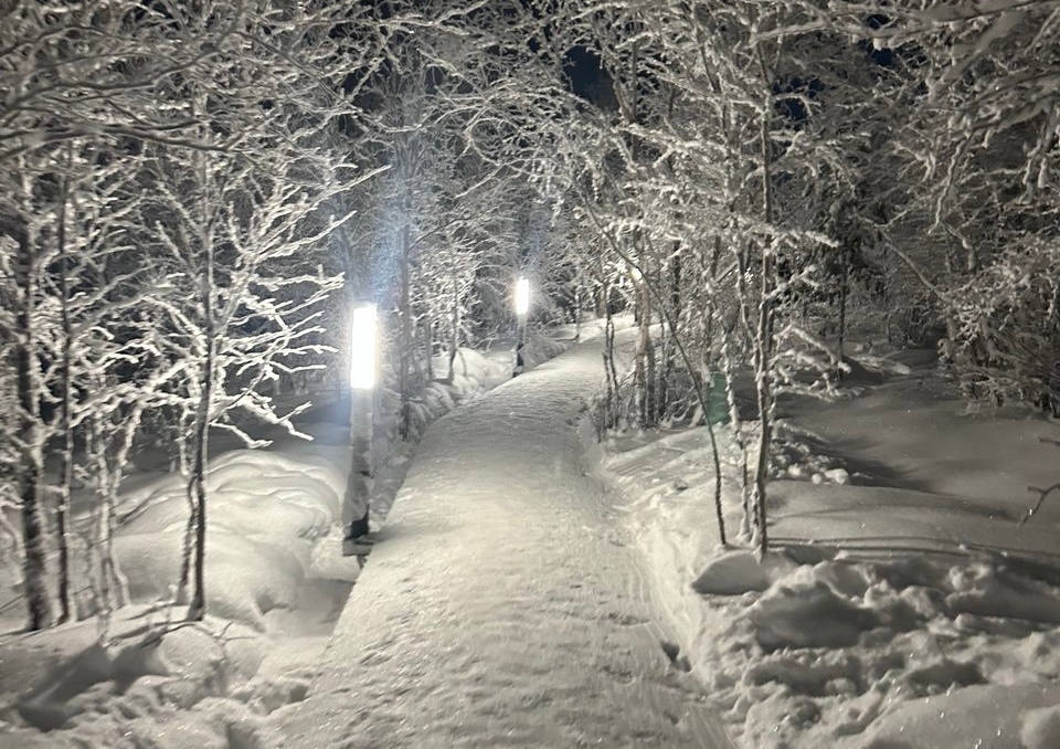 Эти слова подтверждаются опубликованными в паблике спорткомплекса фотографиями. На тропах гостей встречают заснеженные фонари-лампы, а на лестницах подсветку оборудовали под перилами — это сделало пространство ещё более воздушным.