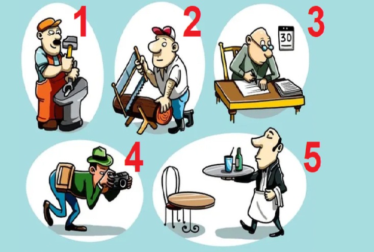 На картинке изображены 5 мужчин различных профессий. За 10 секунд нужно найти среди них левшу.