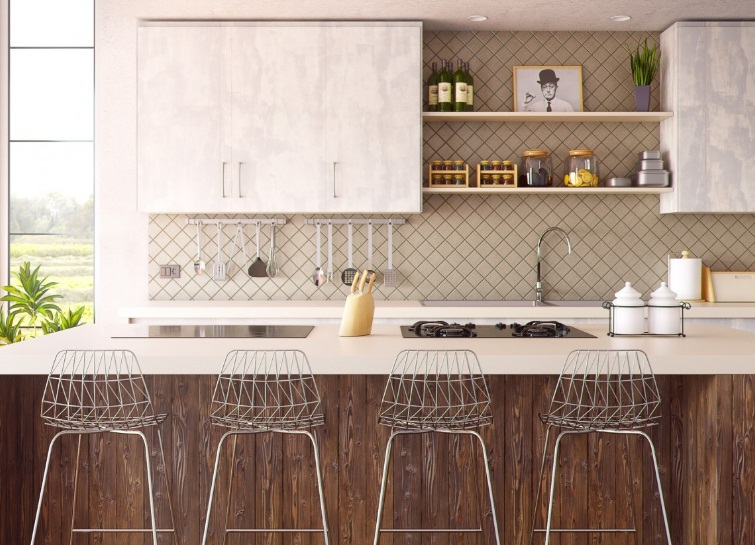 Такой интерьер уродует кухню, делает её несовременной. Опору для стойки лучше создавать снизу, оставляя наверху свободное пространство.