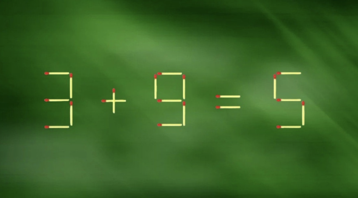 Вот, например, посмотрите на картинку с примером «3+9=5». Очевидно, что здесь есть ошибка. Чтобы её исправить, нужно переместить всего одну спичку. Попробуйте сделать это прямо сейчас.