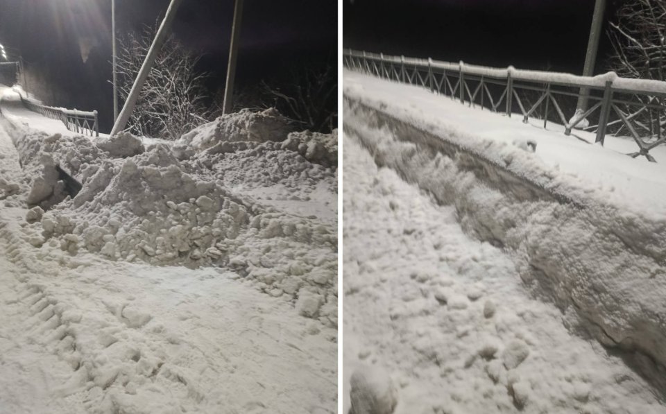 Он выложил фотографии — них видно, что уборка снега на самой дороге вроде была проведена. А вот где на снимках находятся тротуары, даже сложно сказать — всё в снегу. У ограждения вдоль проезжей части — сплошной длинный сугроб.