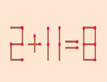 Перед нами пример: 2+11=8. Нужно переставить одну спичку, чтобы равенство получилось верным. На это отводится 10 секунд.